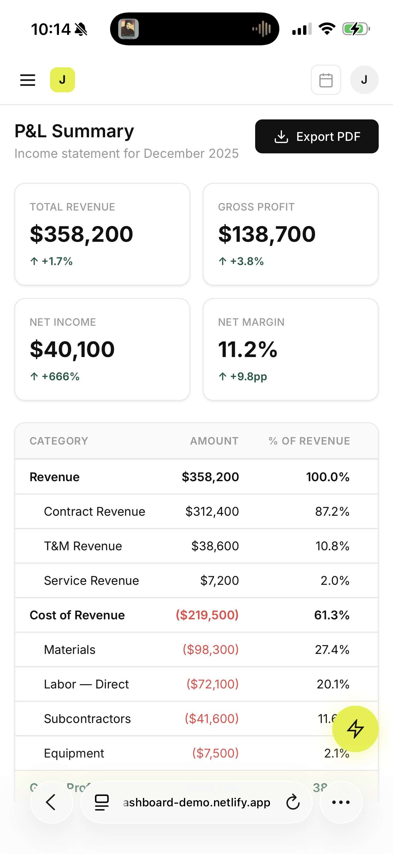 Bookkeeping, job costing, elite financial reporting, and tools you've wished you had for years — built for contractors, powered by AI. One platform that shows you exactly where your money goes, which jobs make you money, and what's killing your margins. No chasing accountants.