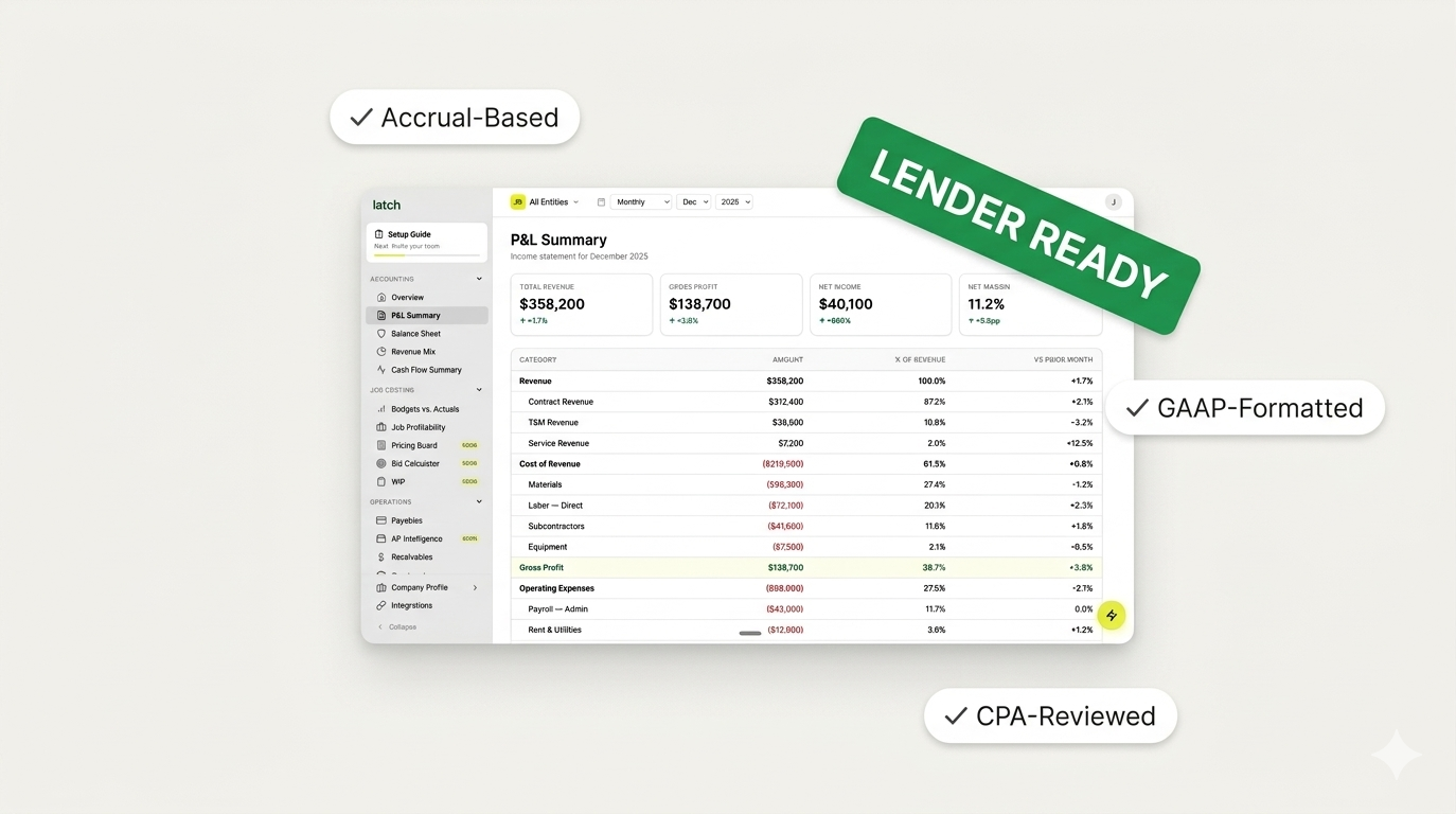 For a limited time, sign up for our control plan and get a free total financial diagnostic + your taxes filed on us.See how Latch helps contractors stop guessing & start knowing their numbers. Get real job profitability, accurate WIP, and bank-ready financials in 30 days or less.