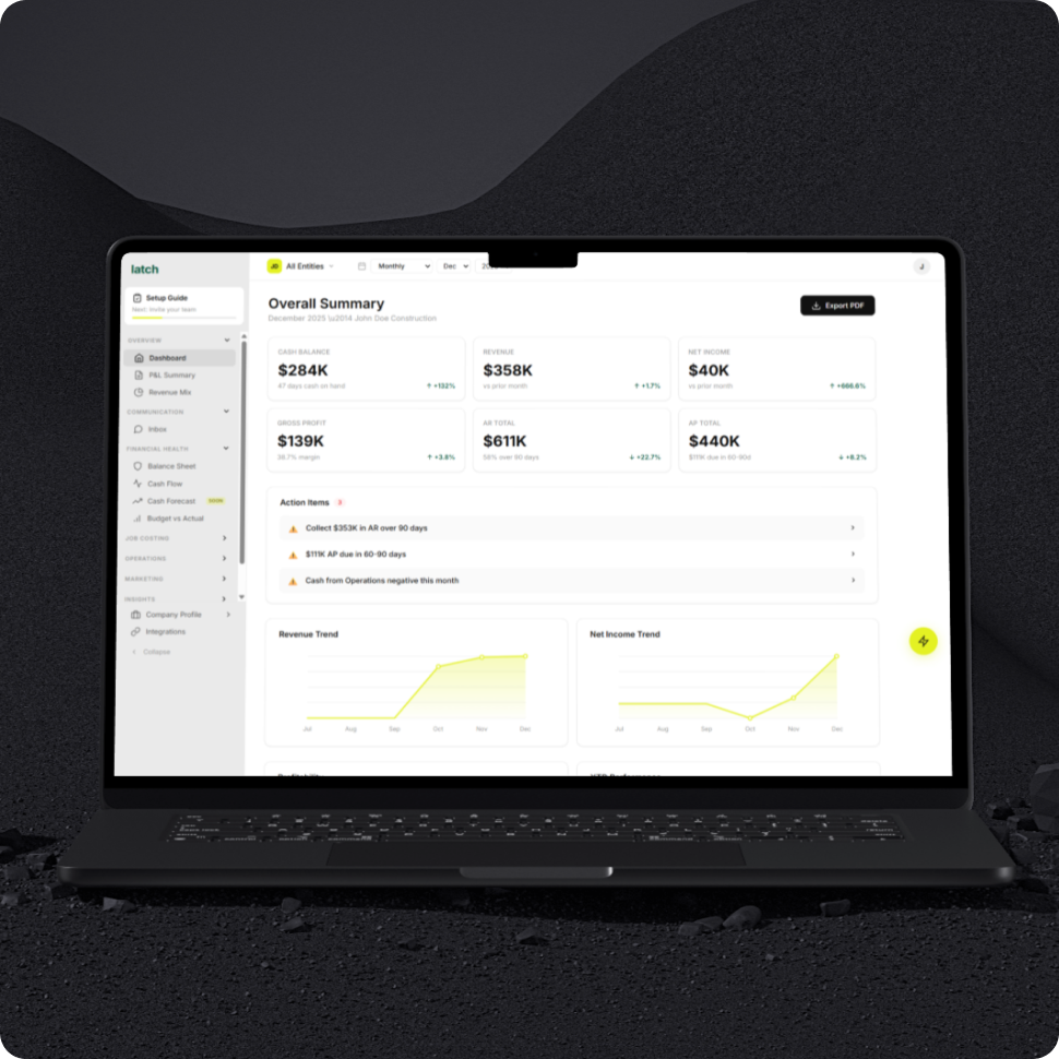 For a limited time, sign up for our control plan and get a free total financial diagnostic + your taxes filed on us.See how Latch helps contractors stop guessing & start knowing their numbers. Get real job profitability, accurate WIP, and bank-ready financials in 30 days or less.